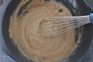 4. Roer de ingrediënten goed door elkaar en voeg dan eventueel nog meer melk toe. Het mengsel mag vrij dik blijven, maar moet wel door te roeren zijn.