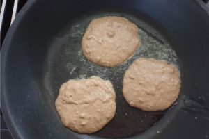 7. Zodra de boter is gesmolten, voeg je drie schepjes pannenkoekmengsel toe aan de pan. Draai de pannenkoeken om zodra ze een beetje beginnen te bubbelen of test door met je pan te schudden of dat ze al loskomen van de bodem. Draai ze om en bak ze ook aan de andere kant mooi bruin.