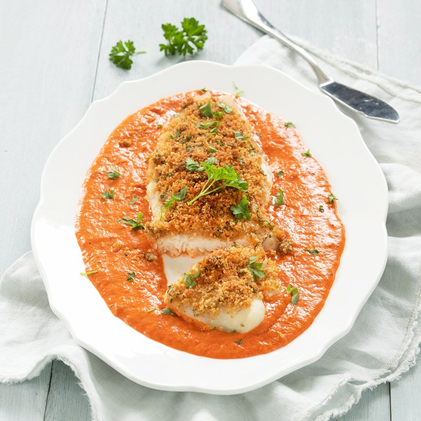 4. Verdeel de saus over borden en leg hier de vis uit de oven in. Serveer eventueel met een frisse salade.