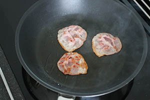 1. Bereid eventueel de pannenkoekjes, als je ze volgens mijn recept maakt gebruik dan geen suiker dit worden hartige pannenkoekjes. Houd de pannenkoekjes warm onder een bord of verwarm ze op het laatst nog even. Bak het spek in een paar minuten krokant in een pan zonder olie of boter. Laat uitlekken op een keukenpapier.