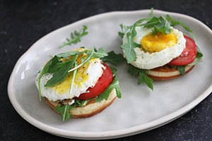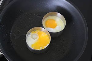 2. Leg een ingevette rookring (ongeveer ter grootte van de pannenkoekjes) in de pan. Doe de eieren hier in met een snufje peper en zout en laat stollen of laat de dooier nog zacht. Leg 2 (verwarmde) pannenkoekjes op een bord. Leg hier een beetje sla op en 1 of 2 plakjes tomaat. Doe hier het eitje op en de uitgebakken bacon. Dek af met de andere pannenkoekjes en steek er een prikkertje in.