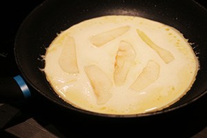 1. Doe de bloem in een kom en voeg een snufje zout toe. Maak een kuil in het midden en kluts daar de eieren in. Voeg ongeveer de helft van melk toe en mix tot een glad beslag. Giet dan beetje bij beetje de rest van de melk er bij tot deze helemaal is opgenomen. Schil de peren en snijd in dunne plakjes. Giet wat beslag in een pan met wat gesmolten boter en leg wat plakjes peer er in voordat het beslag gestold is.
