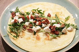 2. Beweeg na een paar minuten de pan voorzichtig op en neer en draai de pannenkoek om. Bak ook de andere zijde mooi bruin. Leg de pannenkoek op een bord en leg wat rucola in het midden. Kruimel wat geitenkaas erover en wat pecannoten. Vouw de pannenkoek dicht en druppel wat honing er over.