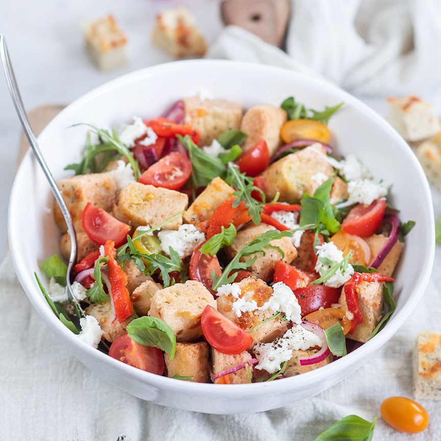 9. Laat de panzanella bij voorkeur een uurtje afgedekt staan zodat de smaken en sappen goed kunnen intrekken.