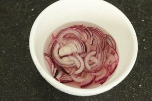 2. Snijd de rode ui in dunne ringetjes. Doe in een kommetje met de witte wijnazijn. Vul iets aan met heet water tot de rode ui net onder staat.