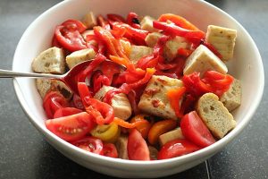 5. Snijd of scheur het brood in stukken. Schep dit door de tomaten en paprika