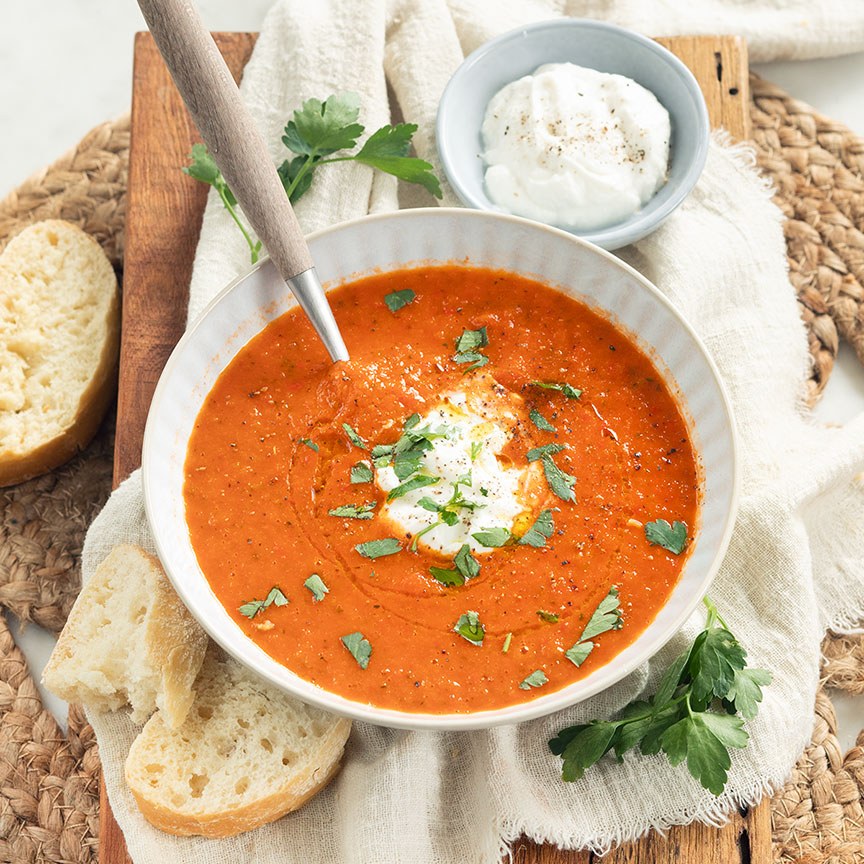 8. Serveer de gepureerde paprika courgettesoep in kommen, garneer met verse peterselie en voeg een lepel crème fraîche toe. Serveer de soep warm en geniet ervan!