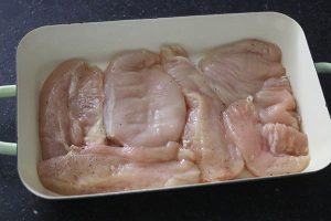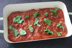 1. Verwarm de oven voor op 200 graden. Snijd de kipfilets allemaal een keer doormidden zodat ze wat platter zijn. Meng de olijfolie met de fijngehakte knoflook, peper en zout en meng met de kipfilets in een kom. Verdeel de kip over de bodem van de ovenschaal. Verdeel de pastasaus er over. Snijd de blaadjes basilicum in stukjes en strooi over de saus.