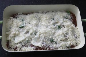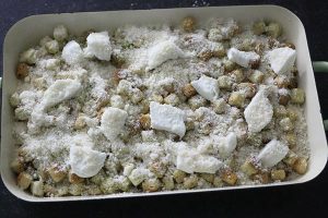 2. Snijd de mozzarella in dunne plakjes en verdeel de helft over de saus. Strooi de helft van de geraspte Parmezaanse kaas er over. Strooi de knoflook croutons over de kaas en dek af met weer een laagje mozzarella en Parmezaanse kaas. Zet de schaal in de oven en bak in ca 30 minuten goudbruin. Lekker met een frisse salade.