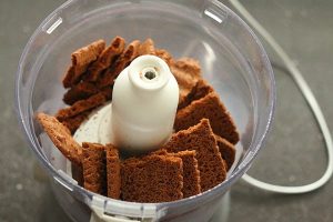 2. Maal de koeken fijn in een keukenmachine. Smelt de boter en roer door de koekkruimels.