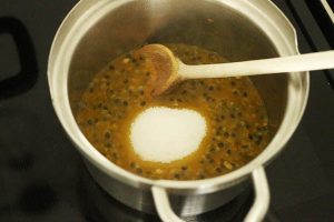 5. Voeg ook de suiker en vanillesuiker toe en laat oplossen.