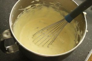 9. Voeg dan het warme passievruchtenmengsel (bewaar een paar eetlepels) toe en mix door met de mixer of garde.