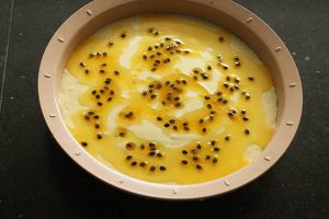 11. Verdeel het overgebleven passievruchtenmengsel over de bovenzijde en trek met een mes of prikker wat swirls erdoorheen.