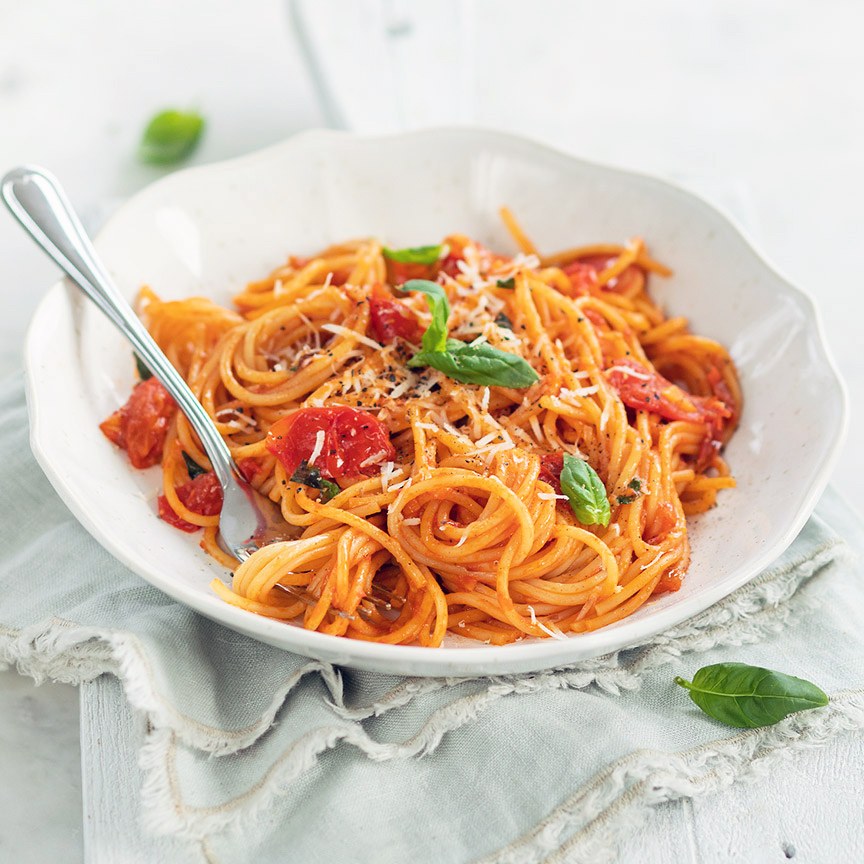 3. Giet de spaghetti af en vang wat kookvocht op. Schep de spaghetti door de tomatensaus. Voeg een beetje kookvocht toe en roer tot een smeuïge saus. Laat het mengsel nog een paar minuten doorwarmen en breng op smaak met wat peper en zout.