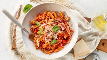 4. Garneer de pasta all’arrabbiata met verse basilicum en Parmezaanse kaas.