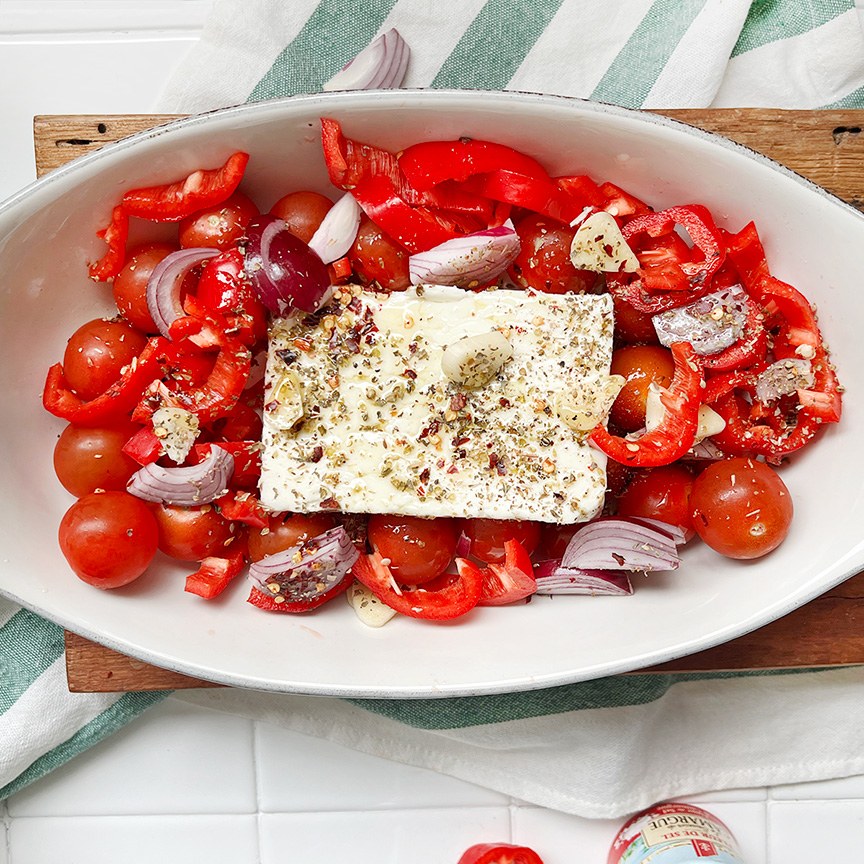 2. Plaats de cherrytomaten en de puntpaprika in reepjes in een ovenschaal. Plaats de feta in het midden van de groenten in de ovenschaal.