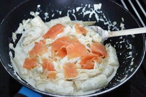 3. Giet de asperges af en vang wat van het kookvocht op. Schep de asperges voorzichtig door de romige pasta. Voeg een scheutje van het kookvocht toe om het geheel smeuïger te maken. Snijd de zalm in stukjes en roer als laatste door de pasta of garneer de pasta hiermee. Bestrooi het gerecht eventueel met wat peterselie.