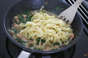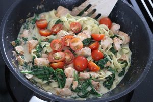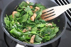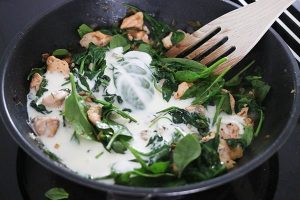 2. Voeg de zalm toe en bak rondom aan, steek met een spatel in stukken. Voeg dan in etappes de spinazie toe totdat deze wat geslonken is. Schenk de kookroom erbij en breng op maak met flink wat peper en zout.