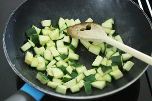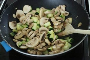 4. Verhit de olie in een grote pan en roerbak de courgette hier in. Voeg na een paar minuten de champignons toe en bak mee. Zorg er voor dat het meeste vocht is verdampt of laat de groenten even uitlekken in een vergiet of zeef.