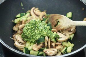 5. Voeg de pesto toe aan de groenten.