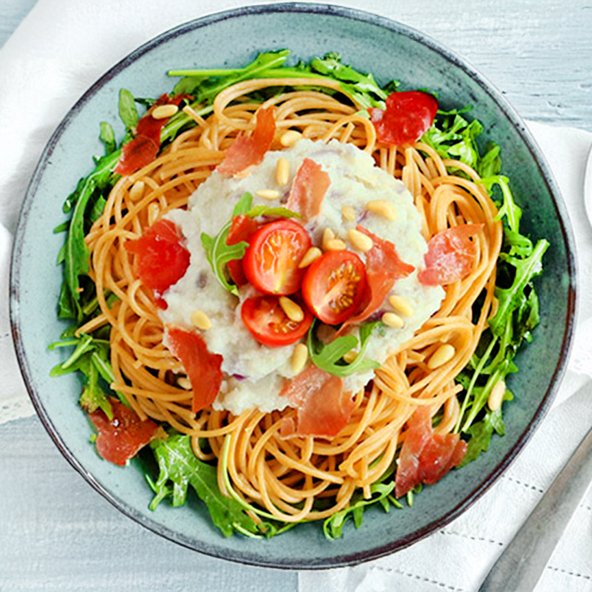 4. Snijd de cherrytomaatjes doormidden en voeg deze samen met bloemkoolsaus toe aan de uien en knoflook. Breng op smaak met peper en zout en verwarm de saus nog een paar minuten voor je hem opdient. Serveer de pasta met de rucola, de bloemkoolsaus, tomaatjes en bestrooi met de stukjes serranoham en de pijnboompitten.