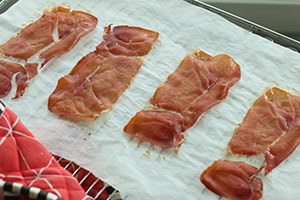 1. Verwarm de oven voor op 180 graden. Leg de plakjes serranoham op een beklede bakplaat en zet hem in de oven gedurende 8 minuten. Breek daarna de krokant geworden ham in stukjes.