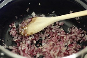 3. Snijd de uien en knoflook fijn en bak ze in een pan met wat olijfolie kort aan.
