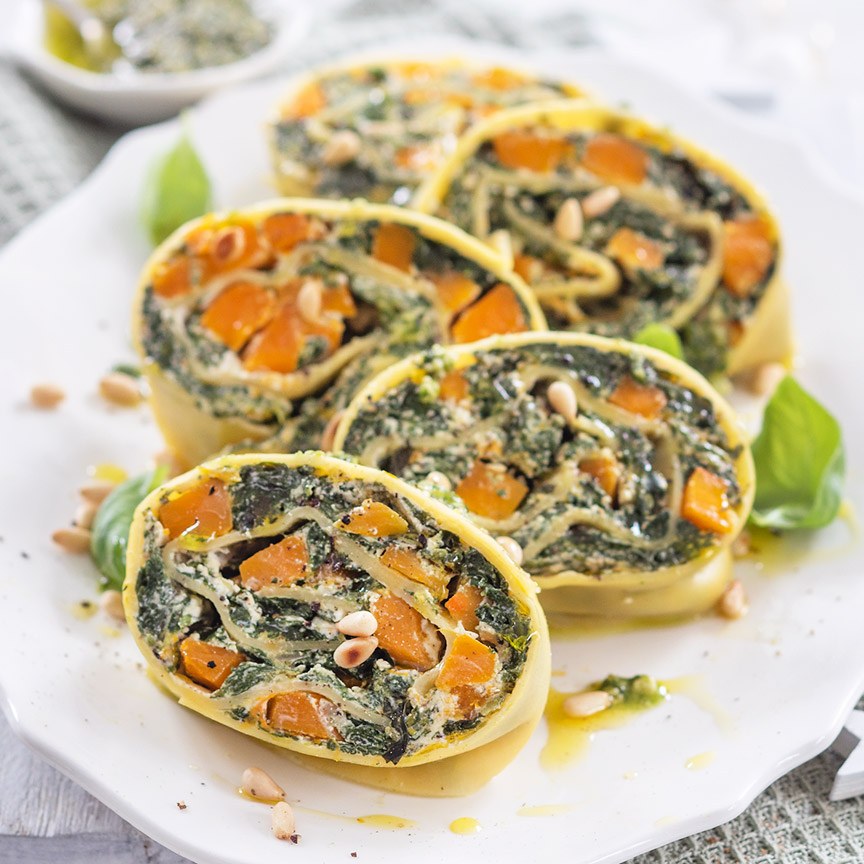 16. Serveer de pasta rollade met een kerstig bijgerecht zoals gepofte bieten met geitenkaas of een zoete aardappelgratin.