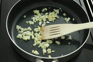 2. Hak de ui en knoflook fijn. Fruit deze in een grote pan.