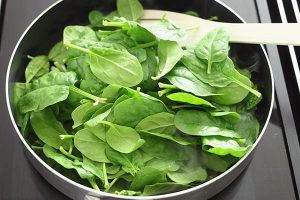 3. Voeg beetje bij beetje de spinazie toe en laat slinken. Laat de spinazie uitlekken in een zeef of vergiet.