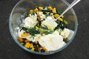 4. Doe de spinazie in een kom en voeg de pompoen toe samen met de ricotta, peper, zout en wat grof gesneden basilicum.