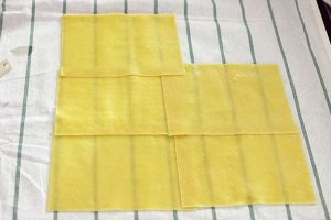 7. Neem een schone theedoek leg hier de lasagnevellen op, twee naast elkaar en 4 boven elkaar. Plak de randen iets op elkaar met het overgebleven geklutste ei.