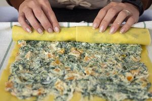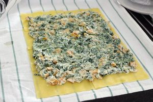 8. Schep de vulling op de grote lap pasta. Smeer uit en houd ca. 2 cm van de rand vrij.