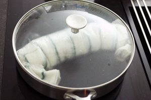 9. Rol hem voorzichtig op met behulp van de theedoek. Rol strak maar druk niet te hard zodat de vulling er niet uit gaat. Rol de plastic folie er strak om en draai de uiteinden op als een snoepje. Knoop goed dicht met touw.