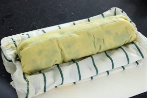 12. Haal de pastarol voorzichtig uit het water en leg op een snijplank. Houd deze even schuin zodat het water eruit kan lopen. Verwijder de theedoek en het plastic en snijd de pastarol in ca. 12 plakken.