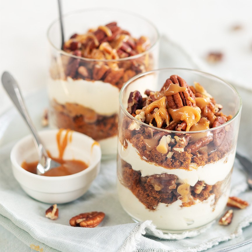 5. Voeg een laagje van de verkruimelde Bastogne koekjes bovenop de room in elk glaasje. Doe hier een beetje van de vloeibare fudge op en wat gehakte pecannoten. Herhaal dit nogmaals met de room, Bastogne, pecan en fudge.