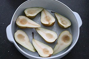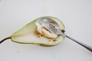 1. Verwarm de oven op 200 graden. Halveer de peren en haal met een lepeltje het klokhuis er uit en de pitjes. Besmeer de snijzijde met een beetje citroensap tegen het verkleuren.