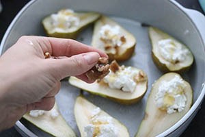 2. Leg de peren in een ovenschaal en vul ze met geitenkaas en kruimel de walnoten er over. Druppel er wat honing over en bestrooi met een klein snufje zwarte peper. Zet ze ca 12 minuten in de oven. Garneer ze met een takje tijm of bestrooi met een beetje gedroogde tijm. Ze zijn lekker als voorgerechtje of hapje.