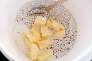 3. Snijd de koude boter in blokjes en voeg deze toe. Wrijf met je vingers of met een deegkneder de boter door het meel tot er kruimels ontstaan.