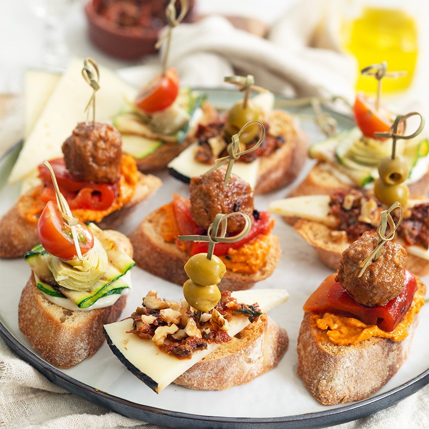 7. Je kunt de pincho’s ca. 2 uur van tevoren maken, maar niet veel langer omdat de broodjes anders zacht worden door de topping.