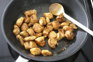 2. Bak de kip in een koekenpan met een beetje olie gaar.