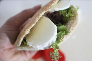 5. Snijd de pitabroodjes open en verdeel er wat sla over. Beleg met wat plakjes tomaat en mozzarella.