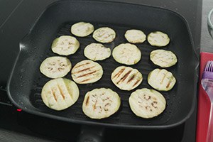 1. Grill de pitabroodjes in een pan, oven of contactgrill. Snijd de aubergine en de halloumi kaas in plakken van ca 5 mm. Besmeer de aubergine plakken met een beetje olie en bestrooi met peper en zout. Grill ze in een grillpan in ca 5 mooi bruin. Bak ook de plakken halloumi met een klein beetje olie en bak ze iets krokant en mooi bruin.