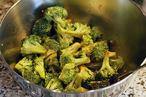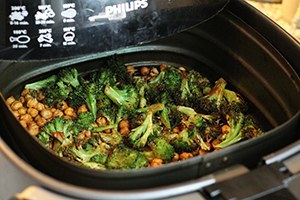 1. Verwarm de airfryer voor op 180 graden. Laat de kikkererwten uitlekken en meng met wat olijfolie, paprikapoeder en een snuf zeezout. Laat dit ca. 4 minuten bakken in de airfryer. Snijd ondertussen de broccoli in kleine roosjes en besprenkel ook met wat olijfolie, paprikapoeder en een snuf zeezout. Voeg dit na 4 minuten ook toe in de airfryer en bak het geheel nog 5 minuten.