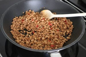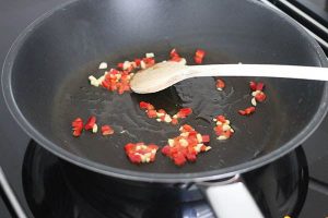 3. Snipper de knoflook en rode peper fijn, fruit deze in een pan met een klein beetje olie. Voeg het gehakt toe en bak mee.