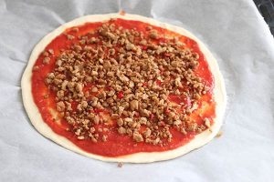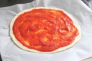 5. Verdeel de pizzasaus erover. Schep hier wat pittig gehakt op.