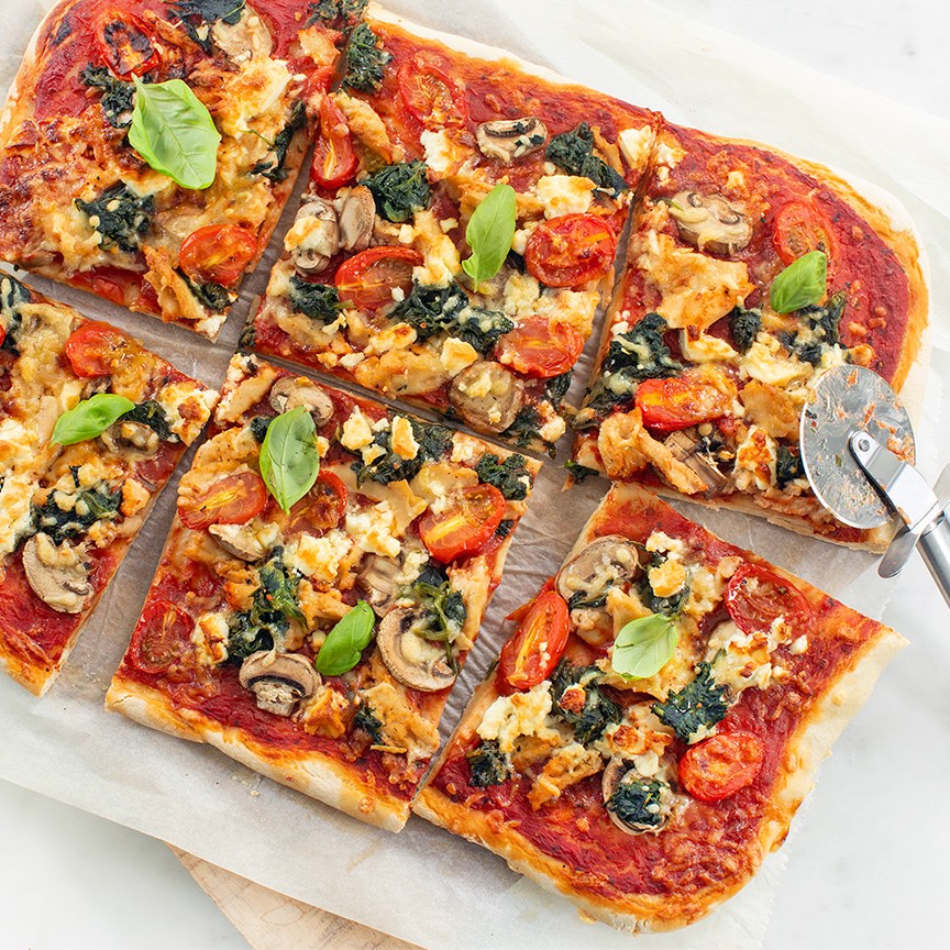 3. Rol het pizzadeeg uit tot een grote rechthoek. Besmeer de bovenzijde met de pizzasaus. Beleg de pizza met stukjes kip. En vervolgens ook met plakjes champignons, de spinazie, gehalveerde cherrytomaatjes, feta en geraspte kaas.