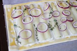 1. Verwarm de oven op 200 graden. Kook de asperges in ongeveer 5 minuten beetgaar. Rol het bladerdeeg uit en vouw de zijkanten om voor een opstaande rand. Verdeel de geitenkaas over het bladerdeeg. Snijd rode ui in halve ringen en verdeel samen me de asperges over het bladerdeeg. Maak dit af met tijm.