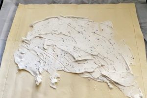 6. Verdeel het geitenkaasmengsel binnen de lijnen van het bladerdeeg.