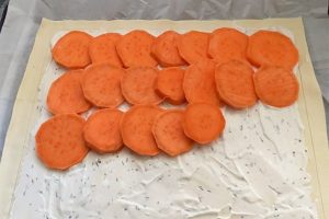 8. Leg deze daksgewijs over het bladerdeeg met smeersel.